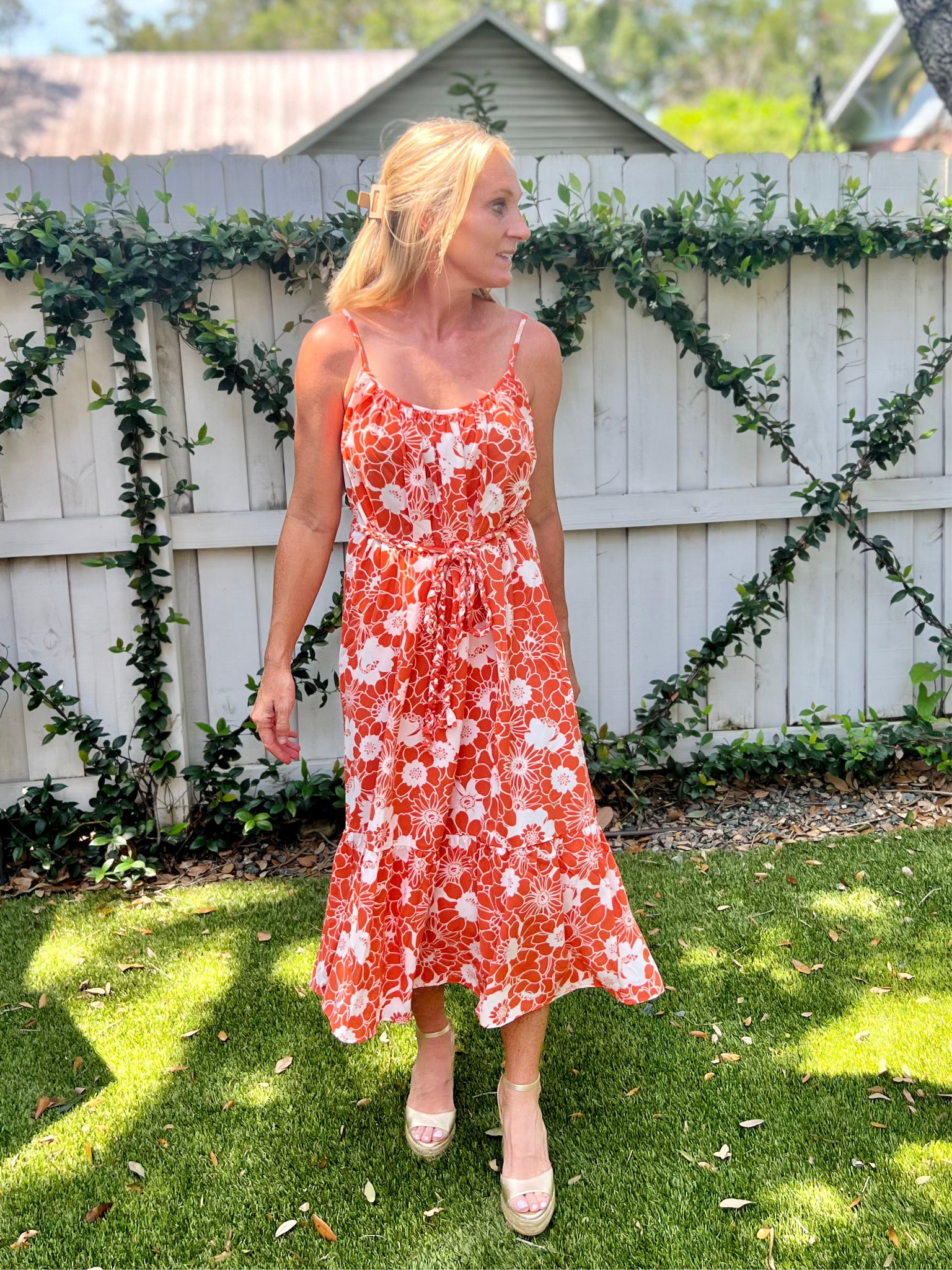 Shine bright in the color of the summer with this stunning Avery Apricot Floral Midi Dress! This dress is vacation ready because she's light weight and easy to pack. Also perfect for summer get togethers, relaxed afternoons with friends or backyard bbq's.